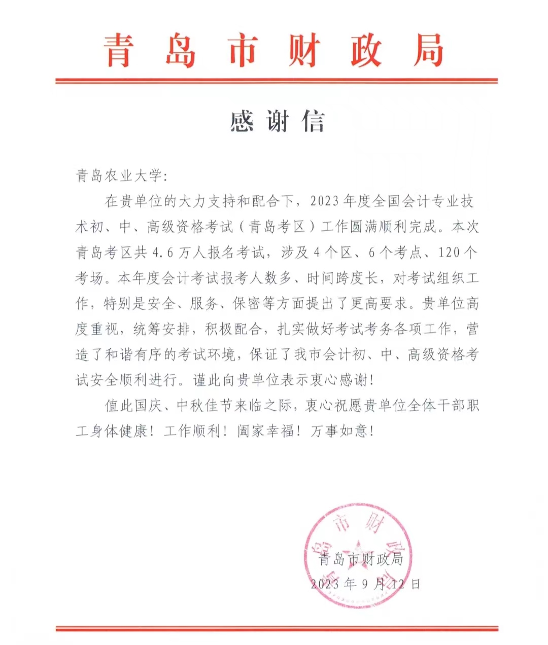 2023年9月12日,青岛市财政局向公司寄来感谢信,感谢公司对2023年度全国会计专业技术初、中、高级资格考试(青岛考区)工作的大力支持和配合。
