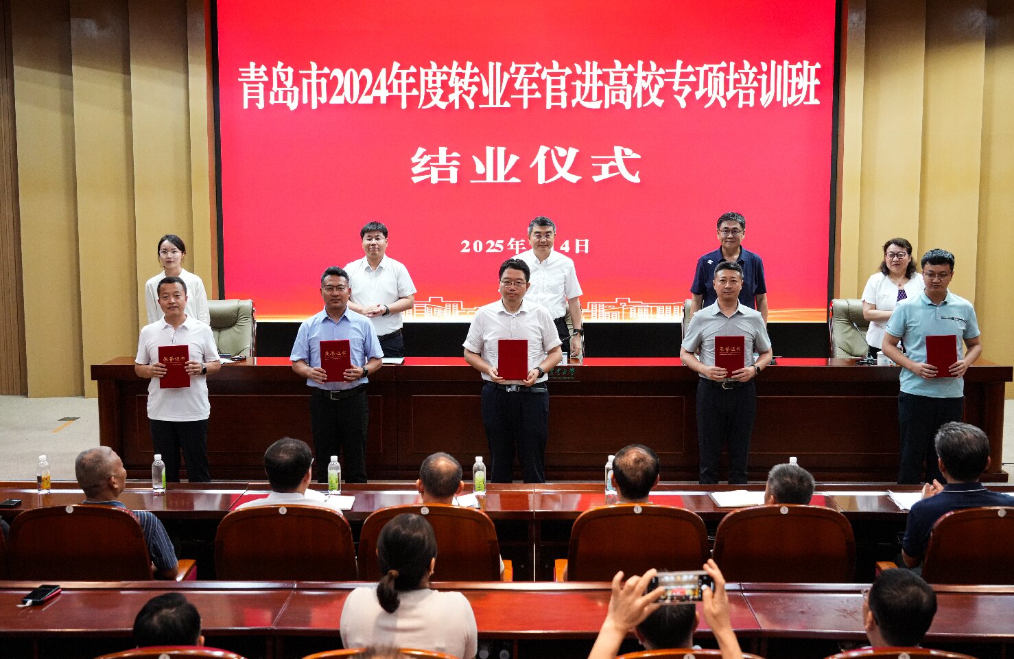 隋国武代表公司向出席结业仪式的各位领导表示诚挚欢迎和衷心感谢。隋国武表示,2025年是中华人民共和国成立76周年,是实现“十四五”规划目标任务的关键一年,公司坚持以习近平新时代中国特色社会主义思想为指导,全面贯彻落实党的二十大、二十届二中、三中全会精神和党的教育方针,深度聚焦国家国防和军队改革对转业军官培训工作的新要求,坚决扛起政治责任,不断创新思路,勇于探索实践,完善教育培训方式,提升教育培训质量,突出高校平台作用,发挥“以平台思维做乘法”效应,积极打造退役军人教育培训旗舰品牌,坚持做到“创新发展、系统发展、精准发展”三位一体有机衔接,为推动青岛退役军人管理服务工作高质量发展,助力学习型社会建设贡献积极力量,先后承担八期青岛市转业军官进高校专项培训任务,培训学员200余人。