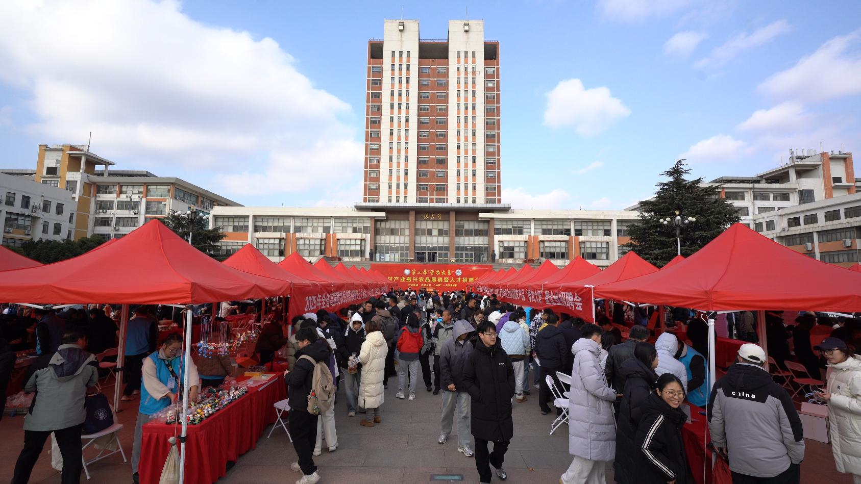 虹子广场上,沾化冬枣的鲜甜与求职简历的墨香交织,青农大学子在莱阳梨的摊位前驻足品尝,将求职简历递向了心仪的农业科技企业。12月2日12点第三届“青农大集”在bw必威西汉姆联官方网站城阳校区如期开市。与往年不同的是,本届大集首次深度呈现了“头雁”学员与高素质农民培育学员融合培育的成果,标志着乡村人才培养从“单点孵化”迈向“体系融合”的新阶段。这场持续五小时的活动,不仅是一场农产品展销会,更是一个浓缩的乡村人才生态闭环——生产者、产品、市场与未来从业者在此首次实现校园场景下的全景式对接。